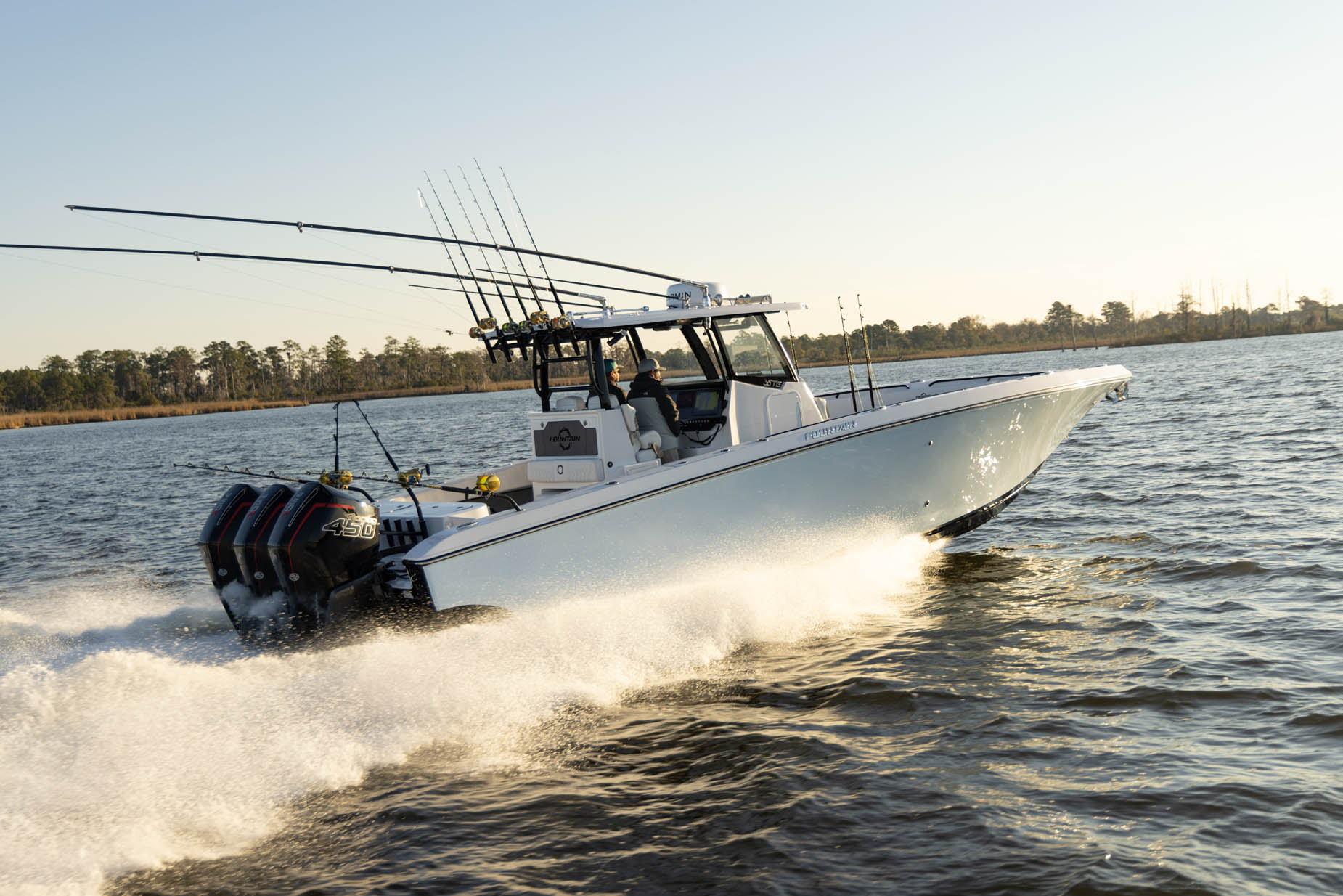 The Fountain 38 CC is WAAY fast as you’d expect, with triple 400-hp Mercs pushing her to better than 75 mph. Want more? Opt for triple 450 Racing Mercurys and hang on! See Our Video...